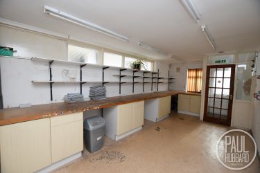 Room 3 has laminate work surfaces around the edge of the room, with shelving above and storage beneath, as well as various spaces for white goods if required. To the rear of Room 3 is a small hallway with a stainless steel hand wash basin, and access to the WC.