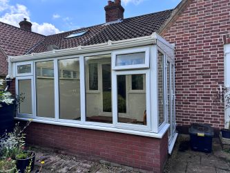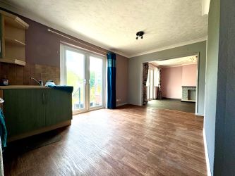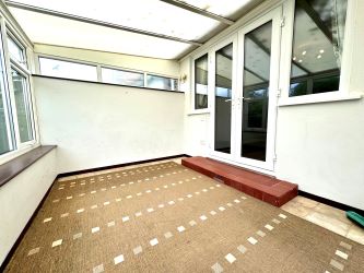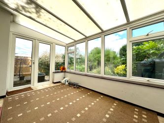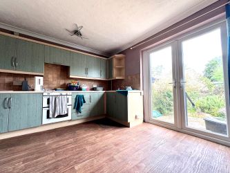 The kitchen links to the seating area via a large opening giving the living space a large open plan living feel, with its patio doors leading to a conservatory, which in turn leads to the rear garden and allows plenty of natural light to flood in, creating a bright and airy atmosphere. Although currently functional , the kitchen offers an excellent opportunity for modernisation. With a bit of updating, this space could be transformed. Another set of patio doors lead out to the rear garden from here too.